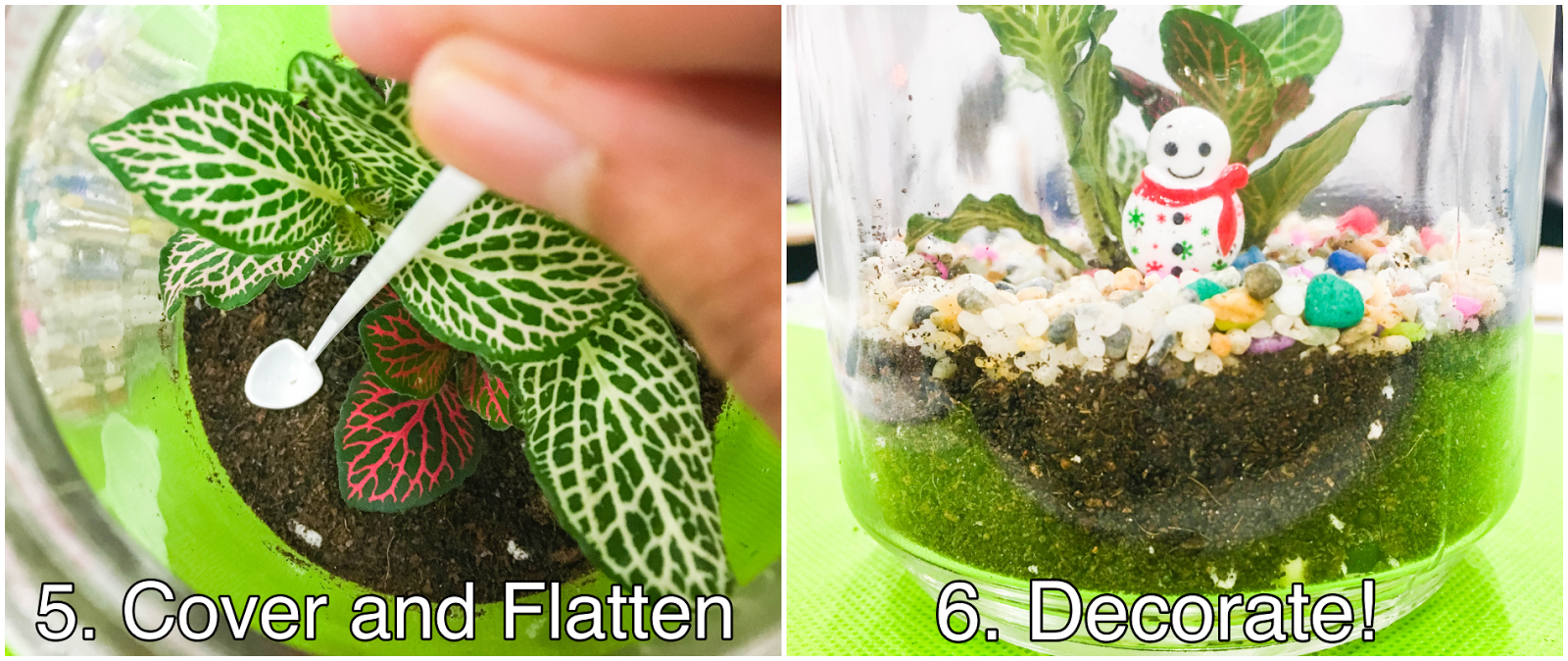 The challenging part was to flatten the soil around the plant. This will make sure that the plant stay rooted and stably upright. I had uprooted my plant once during this process HAHA but luckily i managed to get it nicely covered again without destroying my plant.