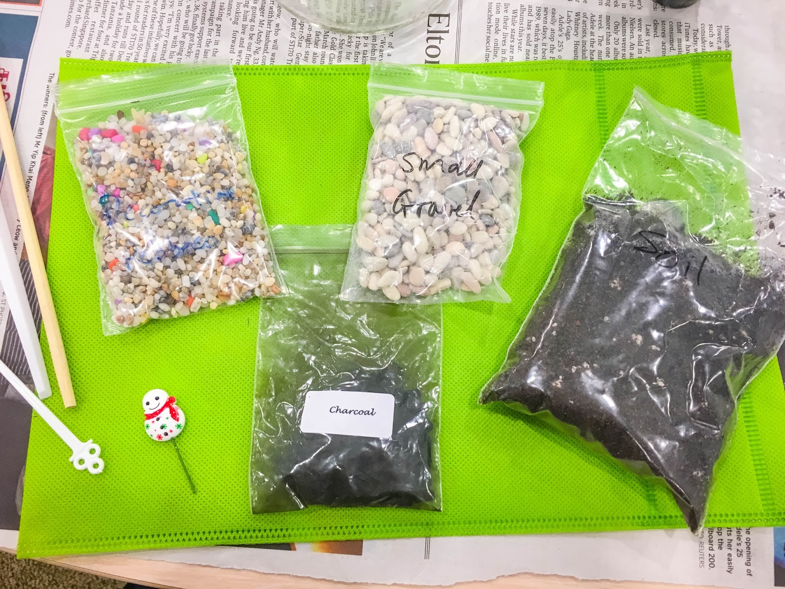 The 'ingredients' - Small gravel, charcoal, soil, decorative pebbles and decoration |