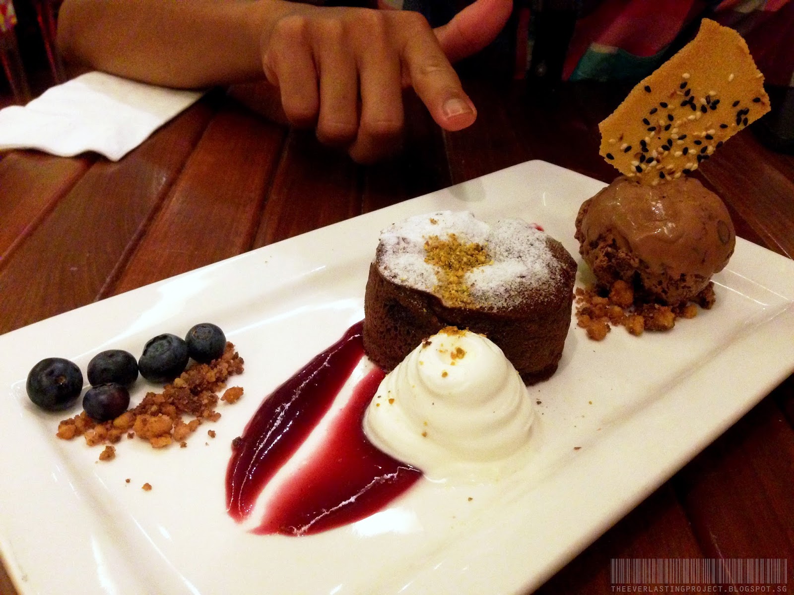Bocas Negras ($12) Chocolate Lava cake with fresh berries on edible soil, citrus espuma, chocolate ice cream and sesame tuille. |